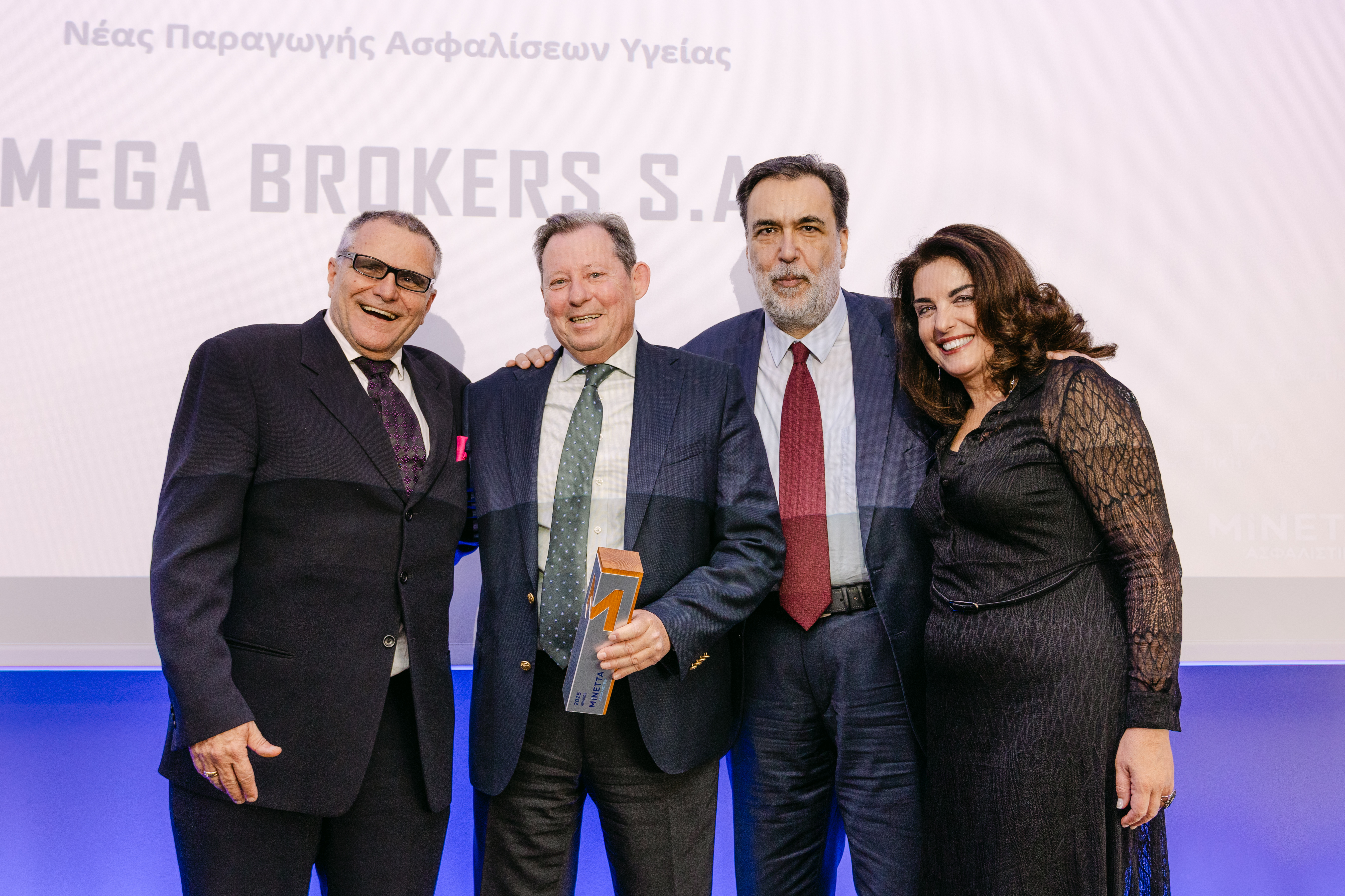 Η MEGA BROKERS απέσπασε τρεις σημαντικές διακρίσεις στο πλαίσιο της εκδήλωσης βραβεύσεων της MINETTA Ασφαλιστική, η οποία πραγματοποιήθηκε στις 31 Μαρτίου, στο Ολυμπιακό Μουσείο Αθήνας, επιβεβαιώνοντας τη σταθερά ανοδική της πορεία και την ισχυρή της θέση στην ασφαλιστική αγορά.