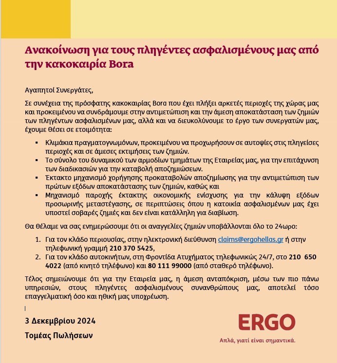 04 Dec, 2024 mega brokers ERGO | Ανακοίνωση για τους πληγέντες ασφαλισμένους μας από την κακοκαιρία Bora Αθήνα, 04/12/2024 ΠΡΟΗΓ. ΑΡΘΡΟ CROMAR GROUP | ΕΓΚΥΚΛΙΟΣ 112 - ONLINE ΤΙΜΟΛΟΓΗΣΗ - ΕΚΔΟΣΗ SECURE HOME GUARD ΕΠΟΜ. ΑΡΘΡΟ ΕΘΝΙΚΗ ΑΣΦΑΛΙΣΤΙΚΗ | Προγραμματισμένη Συντήρηση Μηχανογραφικών Υποδομών.