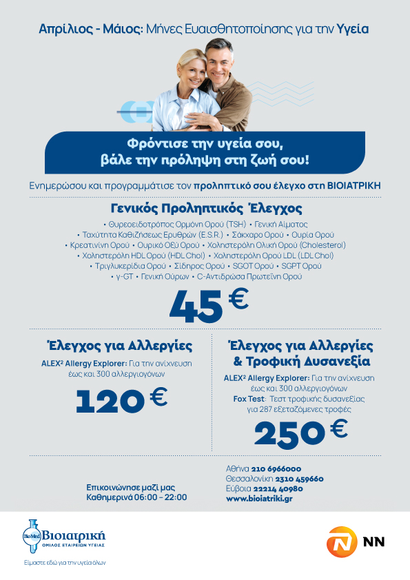 Θα θέλαμε να σας ενημερώσουμε ότι ο όμιλος Βιοιατρική προσφέρει σε όλους τους ασφαλισμένους της ΝΝ, με ατομικό ή ομαδικό ασφαλιστήριο, γενικές εξετάσεις προληπτικού ελέγχου καθώς και εξετάσεις ελέγχου για Αλλεργίες και Τροφική Δυσανεξία.